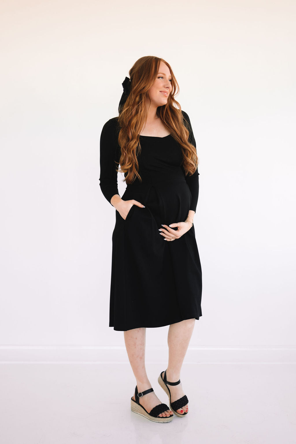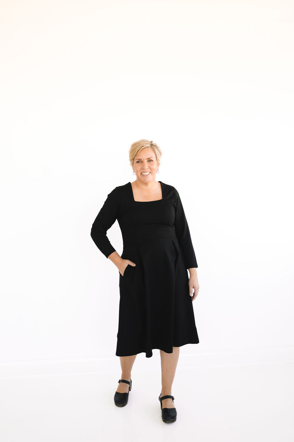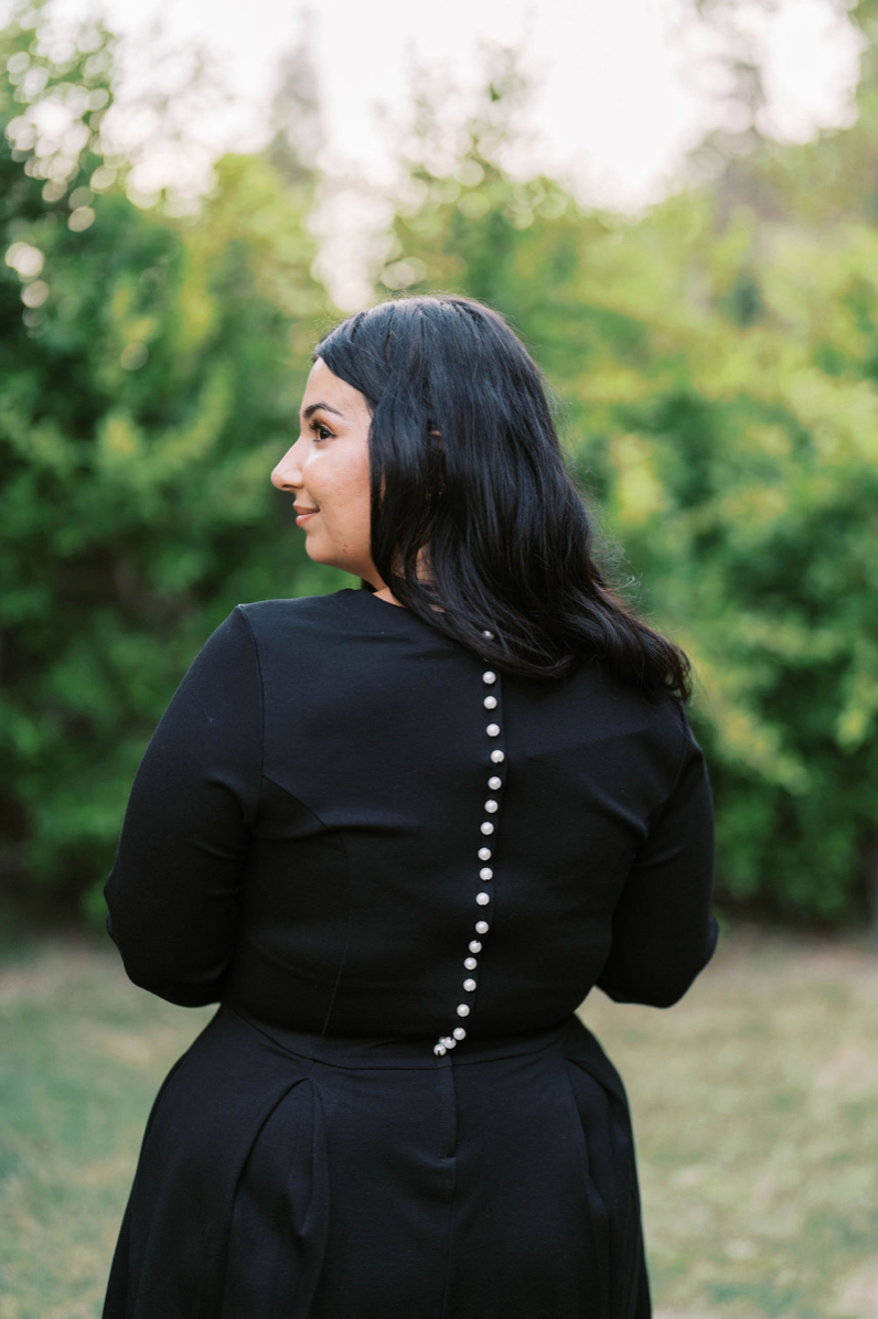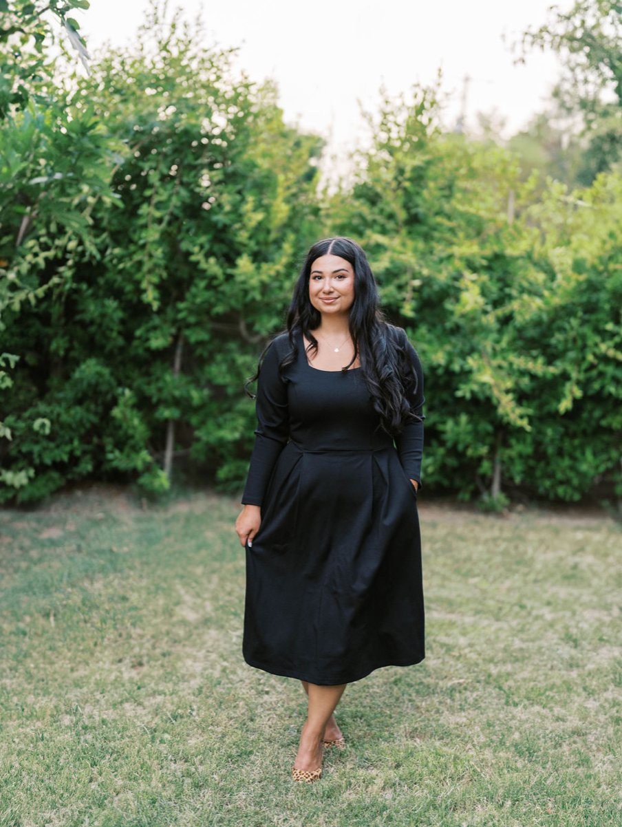 Who said you can't have it all in a dress? The Bella Dress is the definition of the most perfect dress. She comes in the dreamiest fabric that is soft & stretchy! Featuring a square neck, long sleeves, pockets, and an elegant pearl back panel that hides an invisible zipper.