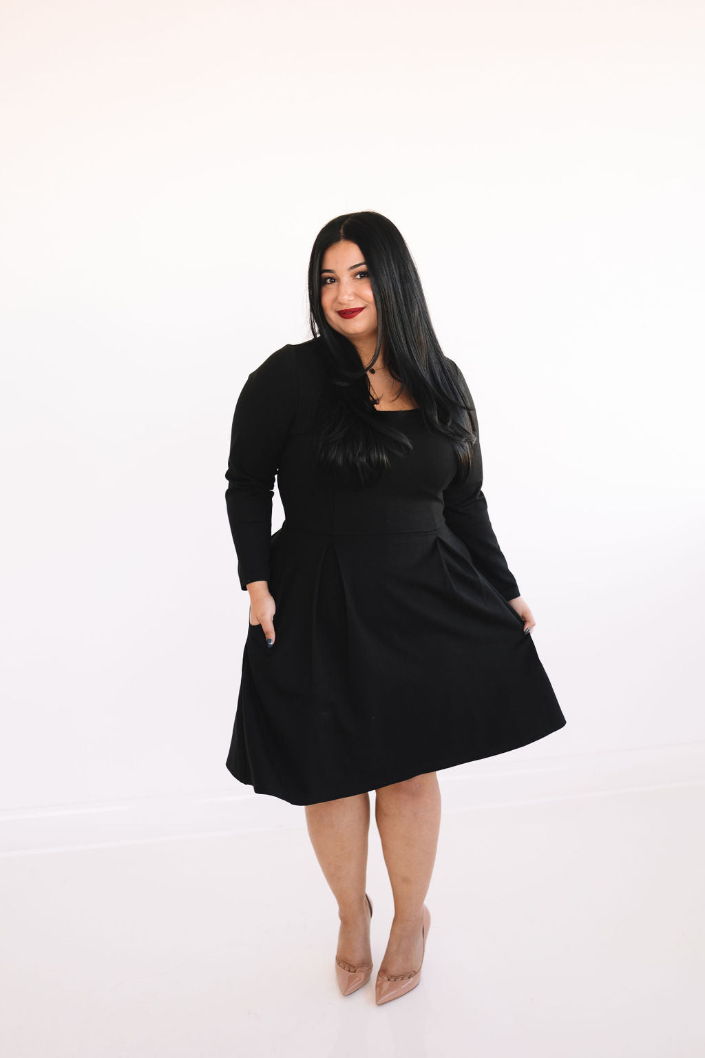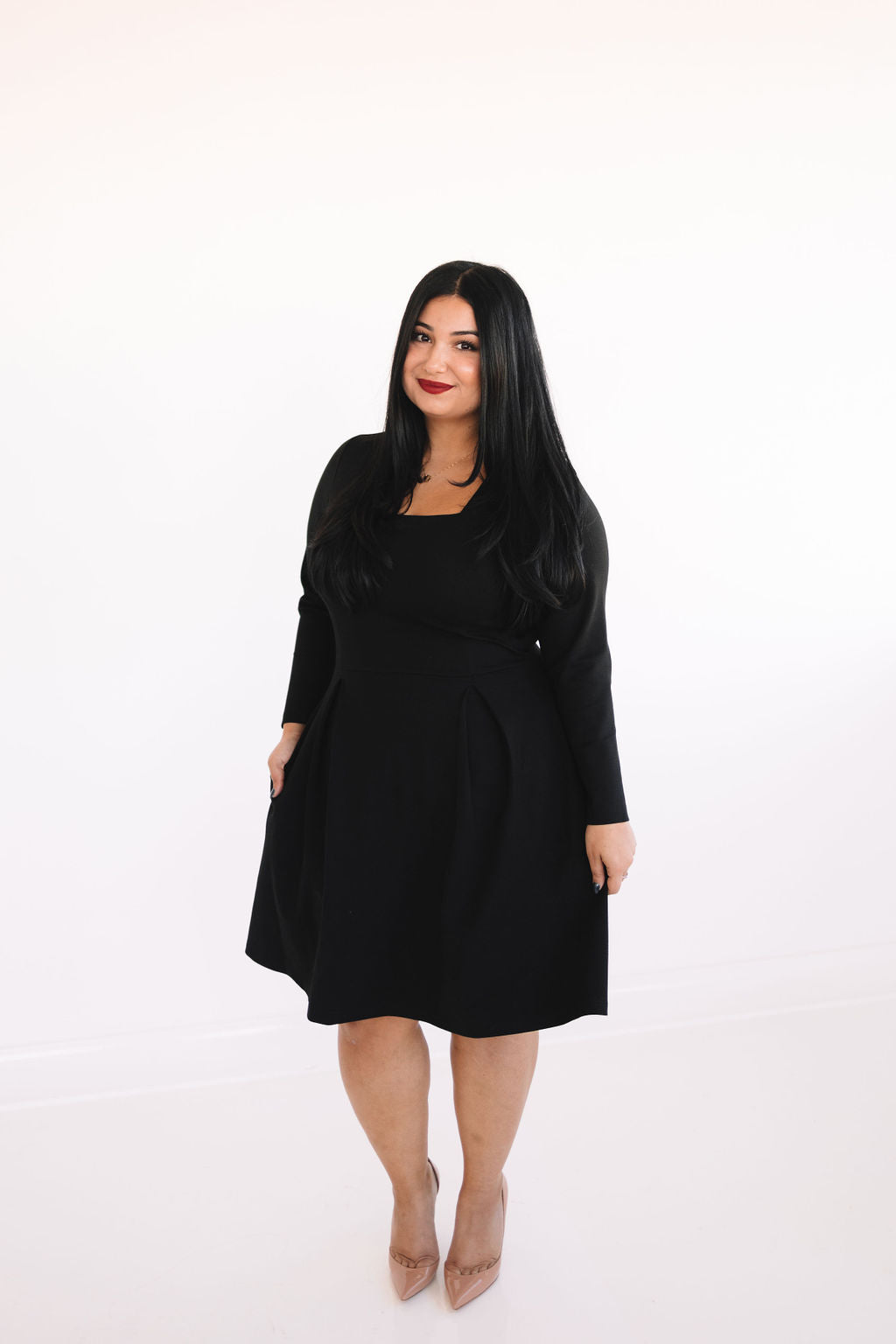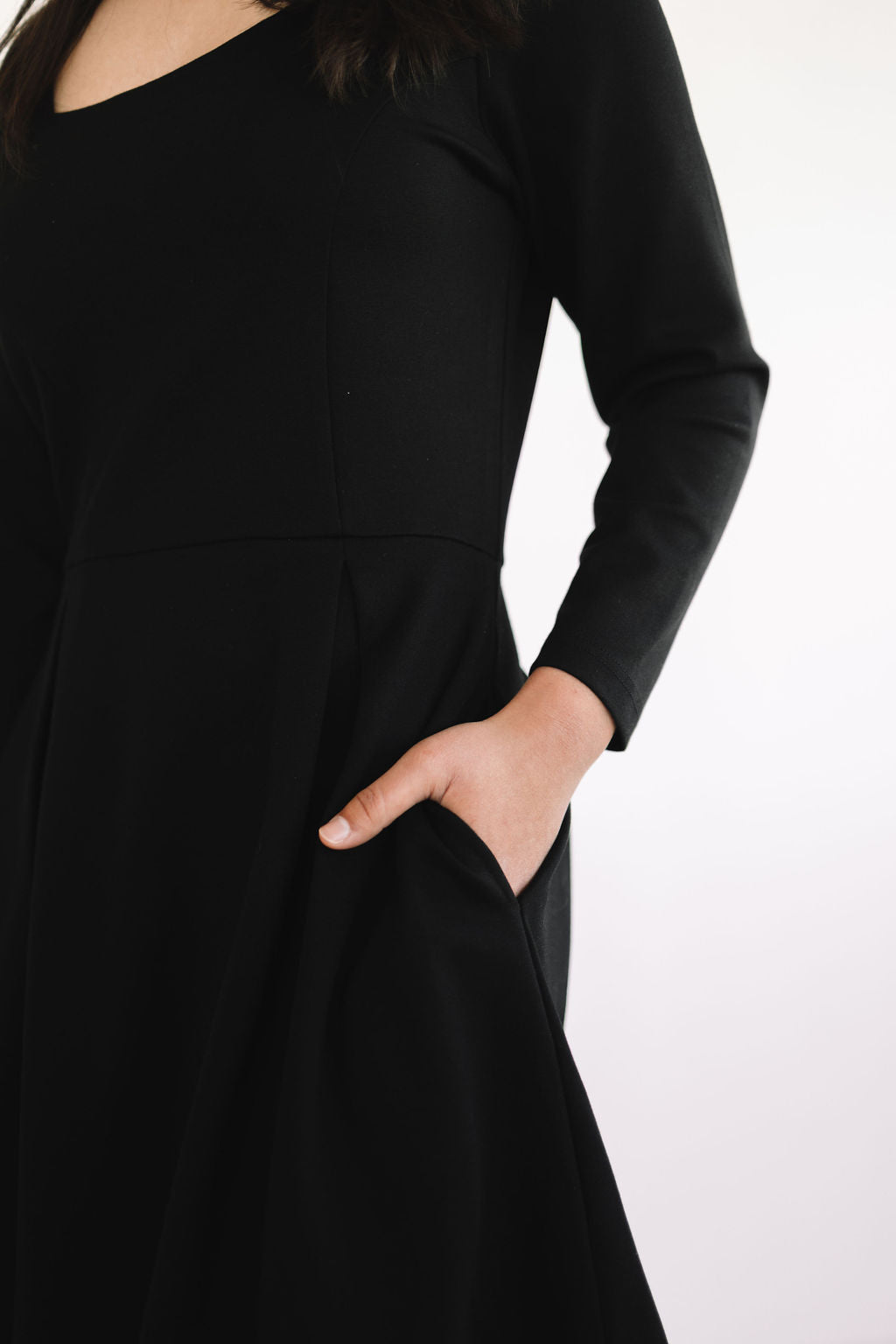 The Short Bella Dress is a fun and flirty silhouette that will have your turning heads! She comes in the dreamiest soft & stretchy fabric, that will make you want to never take it off. Featuring a square neck, long sleeves, pockets, and an elegant pearl back panel that hides an invisible zipper.
