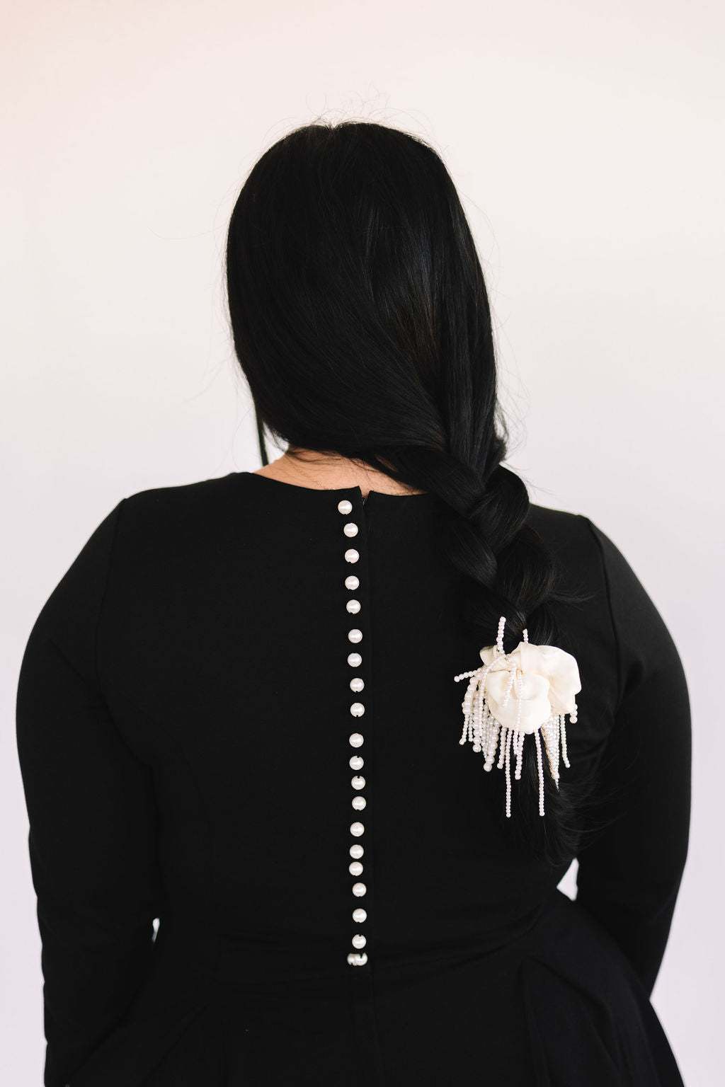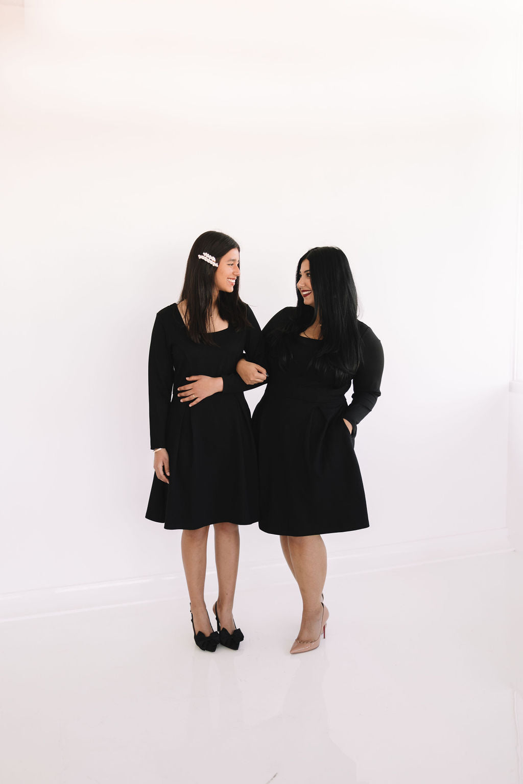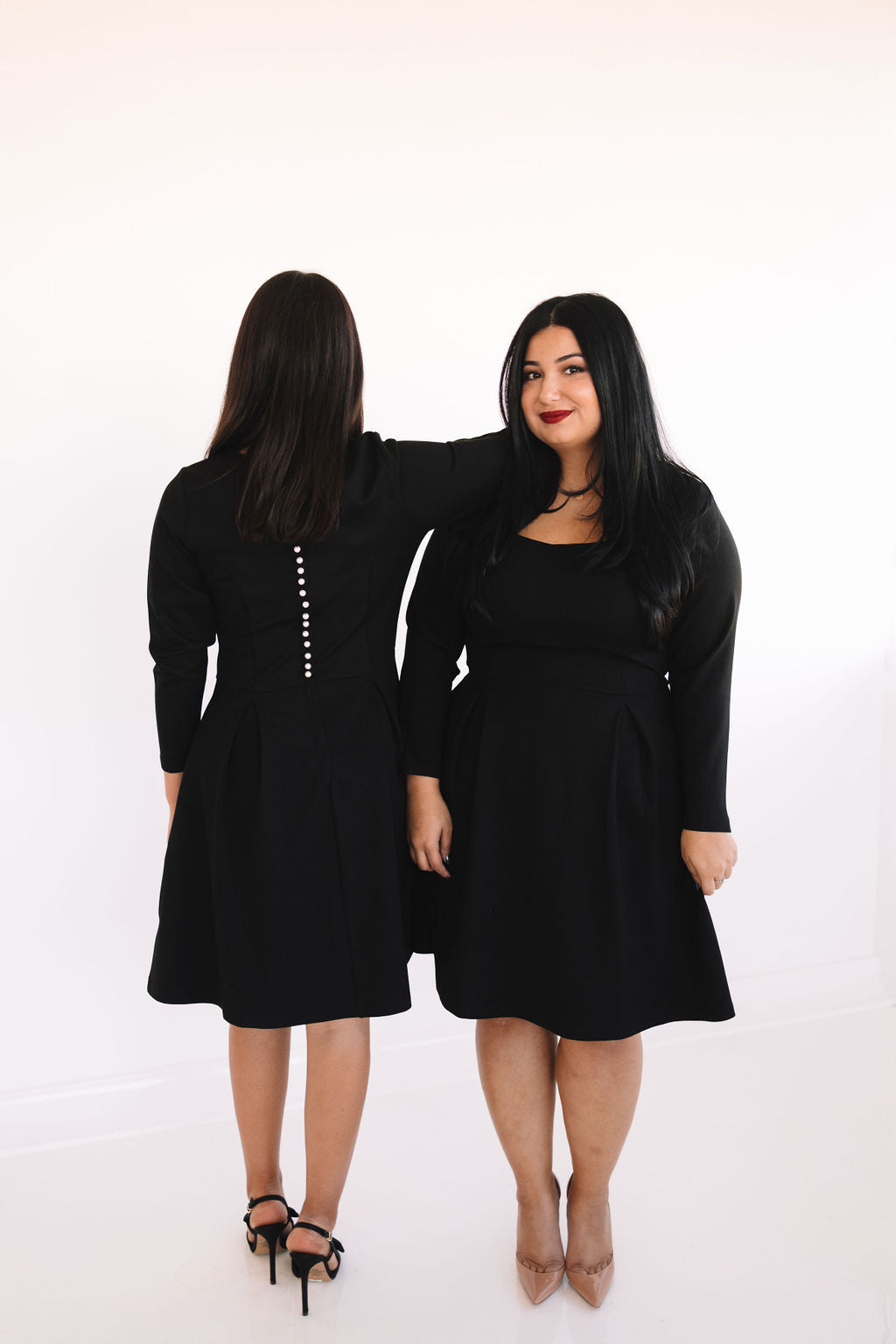 The Short Bella Dress is a fun and flirty silhouette that will have your turning heads! She comes in the dreamiest soft & stretchy fabric, that will make you want to never take it off. Featuring a square neck, long sleeves, pockets, and an elegant pearl back panel that hides an invisible zipper.